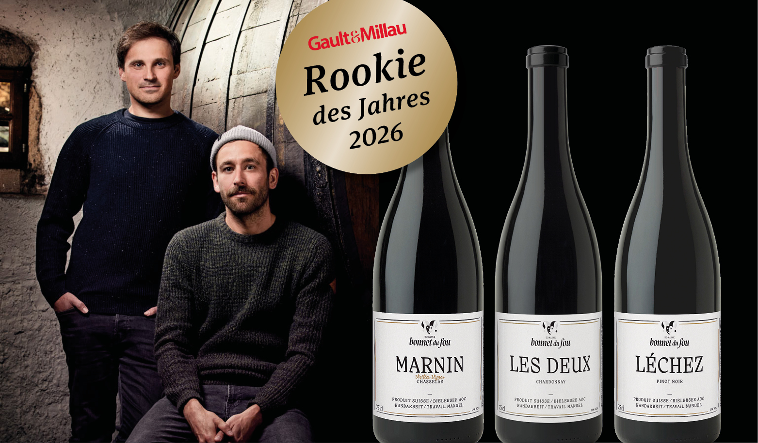 Tolle Erfolgsgeschichte: 2020 erfüllten sich die Quereinsteiger Manuel Schneiter und Roman Thürig mit der Domaine «Bonnet du Fou» (= Narrenkappe) im pittoresken Twann am Bielersee ihren Winzer-Traum. Nur 5 Jahre später gewinnen sie den begehrten Titel «Rookie des Jahres» vom renommierten Gault&Millau!